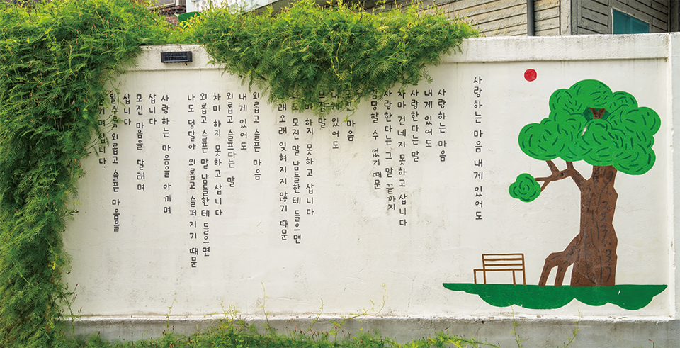 요즘 서울에서 핫하다는 서순라길에 비하면 넓고, 정비가 잘 되어있는 데다가 붐비지 않아서 여유를 부리기에 딱이다. 그렇게 에너지를 충천하고 나면 골목을 다시 걸어보자. 담벼락마다 그려진 정겨운 벽화와 나태주 시인의 따뜻한 시들이 벽을 빼곡하게 메우고 있으니까. 시화와 어우러진 시들이 잊고 지냈던 감성을 채워주는 기분이다. 그래도 아쉽다면 1960~70년대 공주 하숙문화에 대한 추억과 향수를 느낄 수 있는 하숙마을이나, 다양한 전시가 펼쳐지는 자연미술과Ko로 발길을 옮겨보자. 레트로한 느낌과 예술 전시로 가득한 문화 향유의 시간이 될 테니.