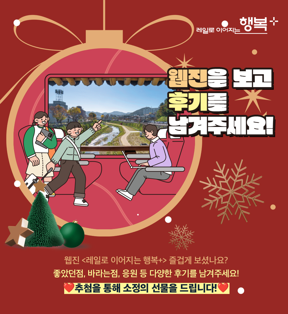 한국철도공사는 수집되는 귀하의 개인정보를 중요시하며 「개인정보보호법」을 준수하고 있습니다. · 개인정보 수집 항목 : 이름, 전화번호, 소속, 부서, 직명, 거주도시 · 제공받는 자 : 한국철도공사 웹진 운영 대행사 경성문화사 · 개인정보 수집·이용 목적 : 격월간 「레일로 이어지는 행복+」 제작에 따른 사용 및 한국철도공사 발전에 대한 제언 활용을 위해 사용 · 개인정보의 보유 및 이용기간 : 이벤트 상품 발송 후 즉시 파기 * 동의를 거부할 권리가 있으며 동의하지 않을 경우 선물 추첨에서 제외됩니다.