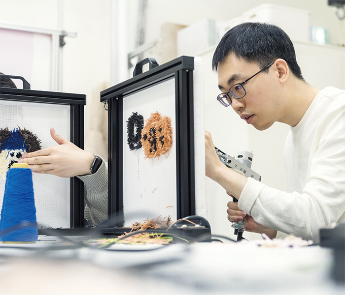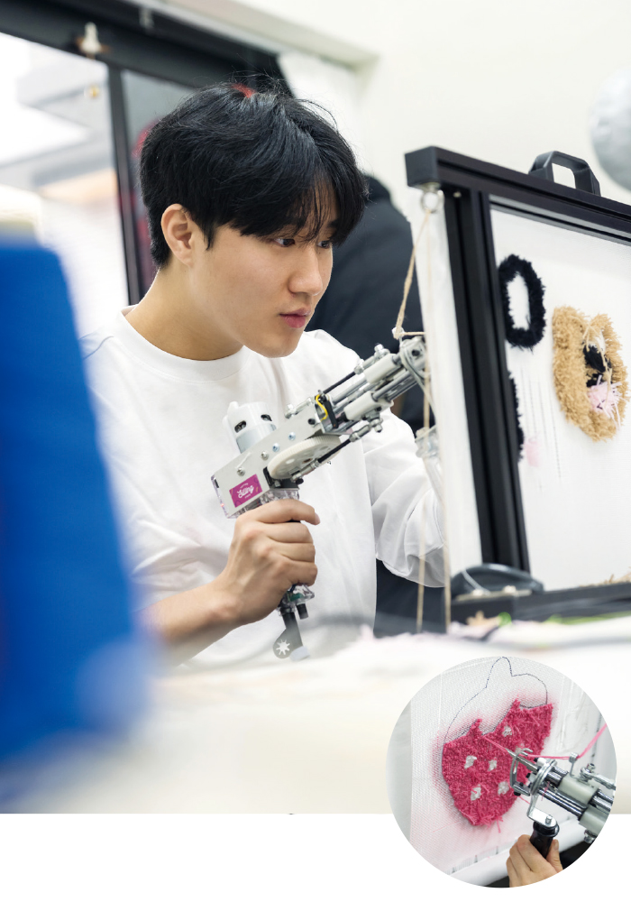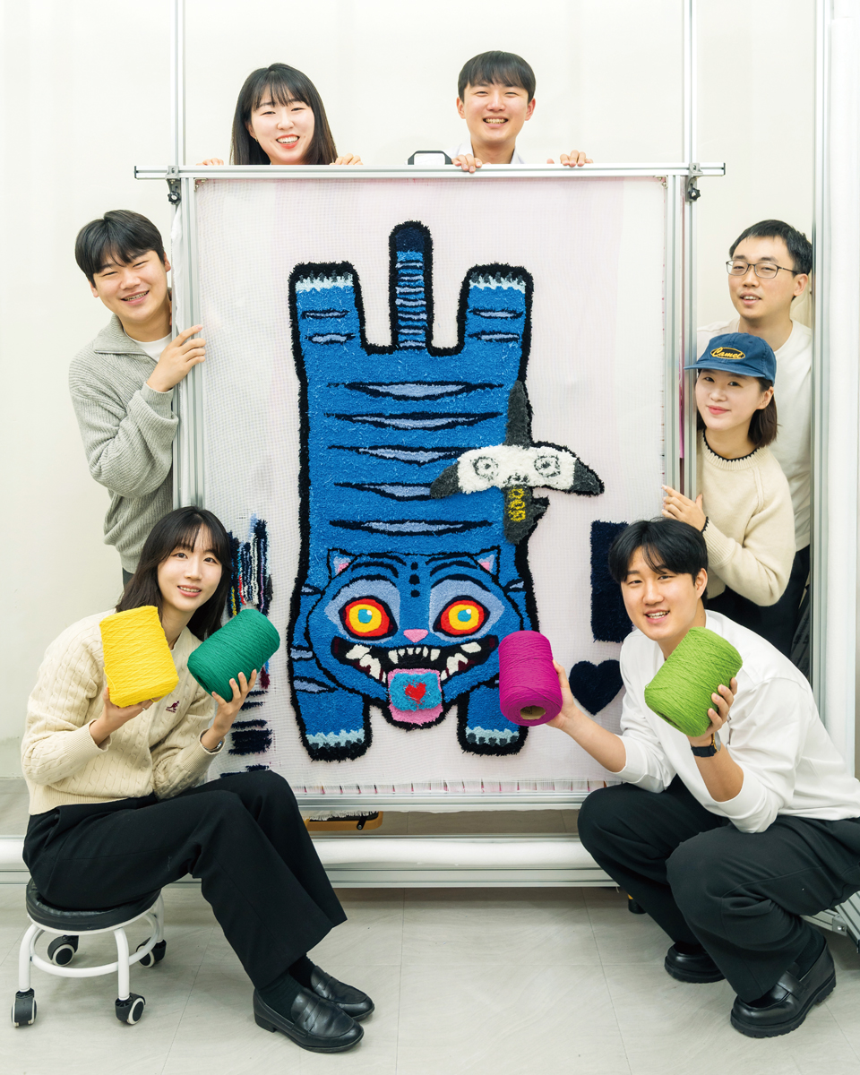 1년차 부기관사 동기들이 터프팅 공방에 모였다. 터프팅(Tufting)은 천 위에 터프팅 건으로 털실을 쏘아 면을 채워가는 공예다. 방아쇠를 당기면 실이 ‘타타타’ 소리를 내며 캔버스에 박힌다.