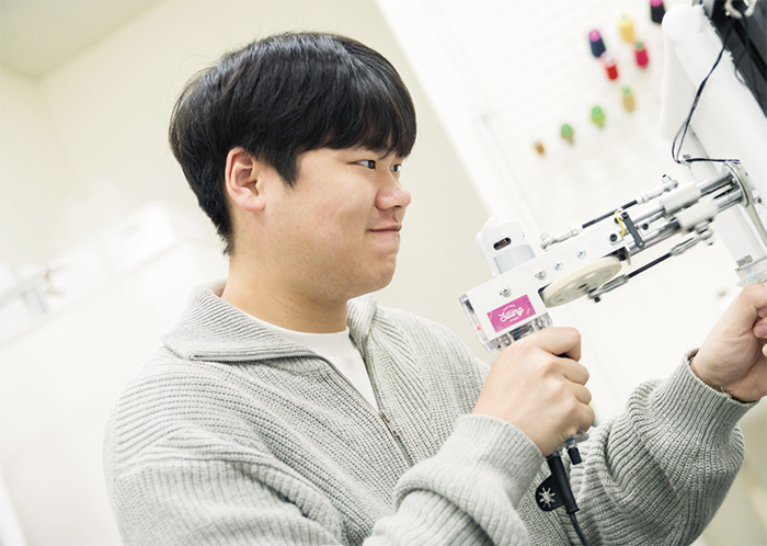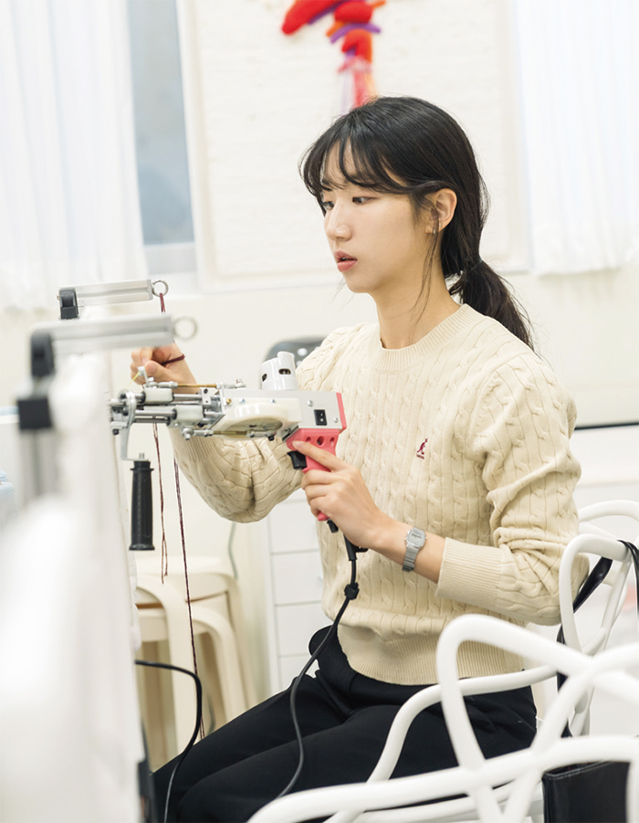 오늘만큼은 입보다 손이 바쁘다. 원하는 색상의 털실을 고른 뒤 터프팅 건에 실을 끼우며 클래스의 막이 올랐다. 터프팅 건을 들자마자 손아귀 가득 묵직한 떨림이 전해진다. 방아쇠를 당기듯 스위치를 누르면 캔버스 위에 차곡차곡 면이 채워진다. 김선엽 부기관사는 추운 겨울날 보기만 해도 따뜻할 것만 같은 붕어빵 키링에 도전했다. “총 쏘는 손맛이 짜릿하네요. 제어하기가 은근히 어렵긴 한데, 스트레스가 싹 날아가는 느낌이에요.”