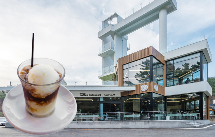 든든하게 밥을 먹었다면 정동진의 바다가 한눈에 보이는 카페로 가서 시간을 보내볼까. 정동진의 많고 많은 오션뷰 카페에서 어게인디엠은 단연 돋보이는 뷰를 자랑한다. 소나무숲 사이로 푸른 동해가 보이기도 하고, 마을을 지나는 기차들이 보이기 때문. 하얗고 높은 기둥이 돋보이는 인테리어가 멀리서도 눈에 띄어 쉽게 찾을 수 있다. 이곳의 시그니처는 앞에 ‘ADM’이 붙은 커피류다. ADM슈페너, ADM블루솔트라테, ADM레몬셔벗커피. ADM에서의 추억을 잊지 않고 싶다면 마셔봐도 좋다. 그중에서도 ADM레몬셔벗커피는 상큼한 레몬 아이스크림이 쌉싸래한 커피 맛을 잡아 주는데 커피의 쓴맛이 싫어서 기피하는 사람도 잘 마실 수 있는 메뉴다. 여기에 디저트를 곁들이고 싶다면 쑥붕어떡&젤라토를 추천한다. 쫄깃한 식감의 쑥뿡어와 젤라토가 생각보다 조화롭고 맛있다. 음료와 디저트 게다가 곳곳이 포토존이니 이만하면 시간을 투자할 만하지 않은가!