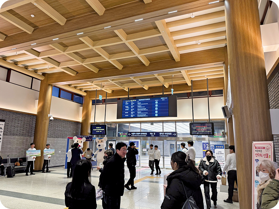 고객맞이 행사 포토월 위의 안동역 현판이 매우 멋있었다. 다른 역에서는 볼 수 없었던 이 현판이 궁금해 검색해보니, 유교문화의 숨결이 살아있는 안동의 지역적 특색을 반영하고, 퇴계 이황 선생의 학문과 사상을 본받고자 특별히 친필을 집자하여 제작된 현판이었다. 현판에서 뿜어져 나오는 장엄한 기운과 함께 전통 격자무늬의 안동역 천장이 내게 웅장한 느낌을 주었다.